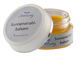 Sonnenstrahlbalsam Mit Rosen-, Vanille- und Jasminöl vermittelt der zarte Balsam Zuversicht und Sicherheit. Ideal zur beruhigenden Fuß- oder Handmassage, oder einfach auf Hals, Handgelenk oder Solar-Plexus auftragen. |