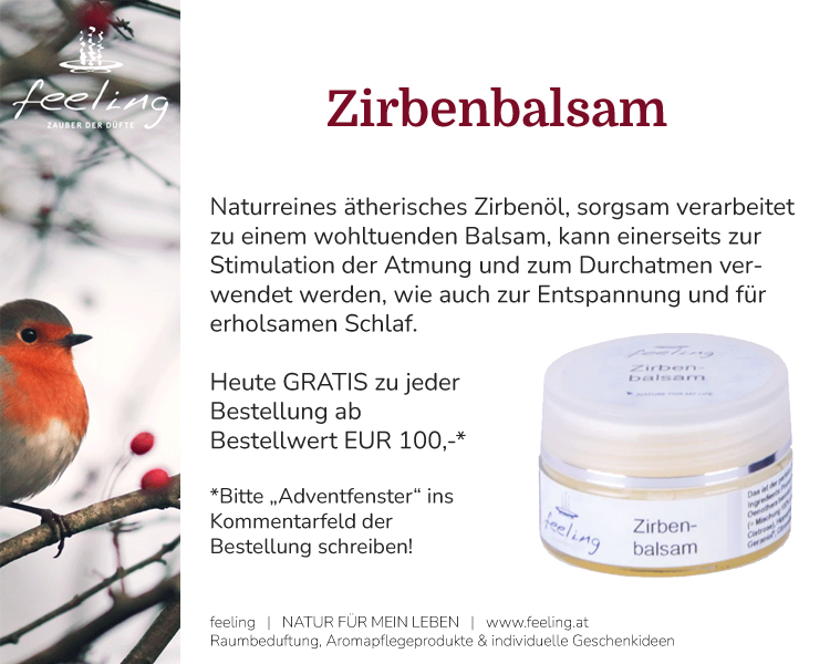 Naturreines ätherisches Zirbenöl in Form eines pflegenden Balsams erleichtert das Durchatmen und sorgt für einen entspannten Schlaf.